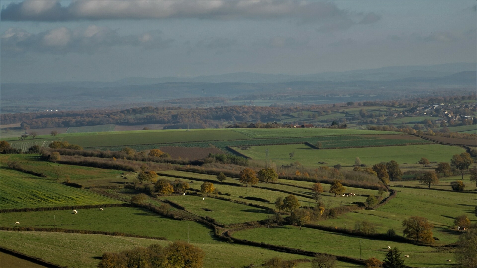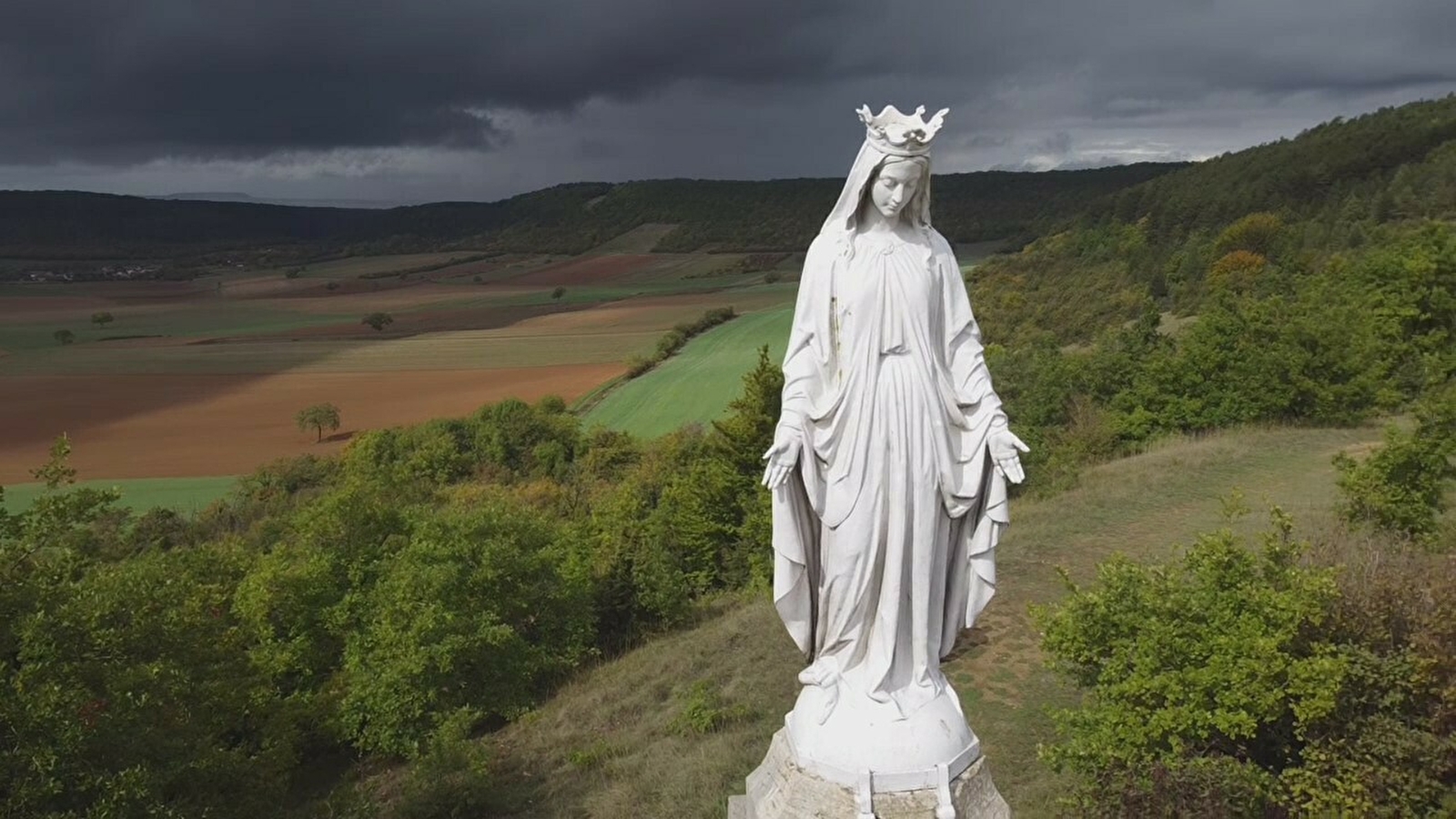 Une statue de la Sainte Vierge domine Asnan et les ondulations bocagères du corbigeois.