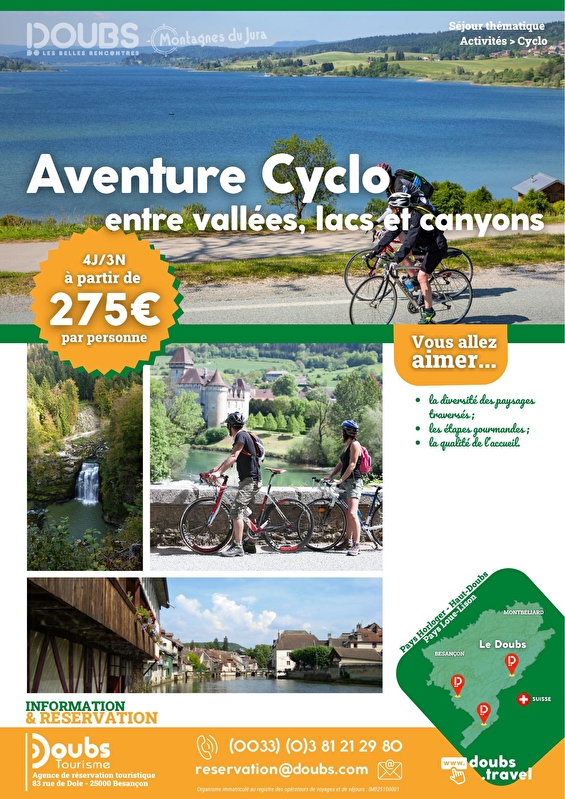 Passant par les bassins du Doubs, le somptueux lac de Saint-Point, le sommet du Mont d'Or, ce circuit de 255 km est à la hauteur des exigences des cyclotouristes curieux et aguerris. Paysages majestueux, patrimoine architectural remarquable, points de vue à couper le souffle, viendront embellir votre parcours à chaque étape.Réservez votre séjour à partir de 275 €