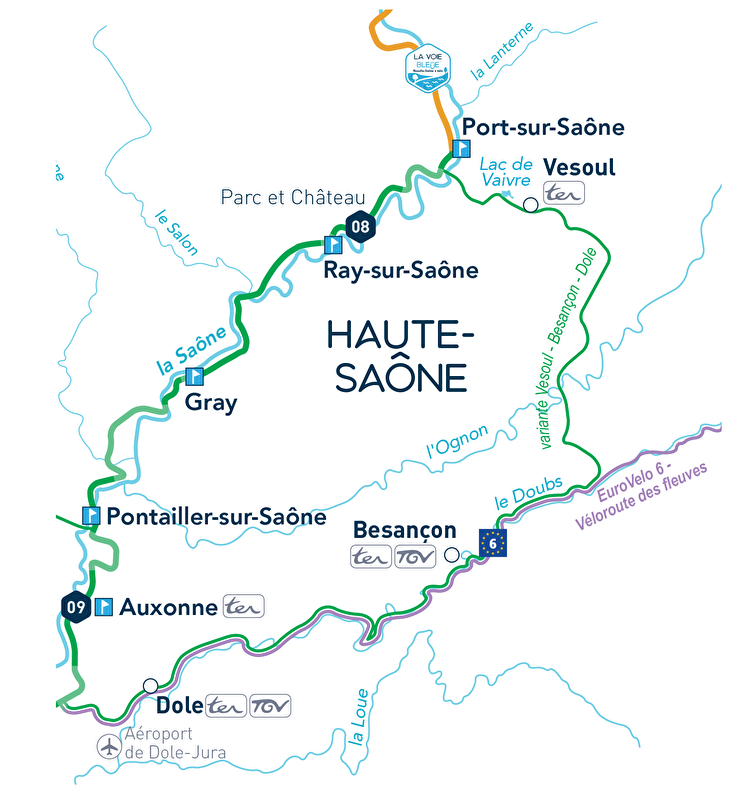 Cette boucle cyclotouristique relie les charmantes villes de Vesoul, Besançon et Dole, tout en empruntant itinéraires cyclables bien balisées, dont la trace du Courlis, l'Eurovélo 6 et la V50 (La Voie Bleue). Ce tracé offre un mélange parfait de culture, de nature et de détente, idéale pour les passionnés de cyclisme et de découvertes. Profitez de chaque instant sur ces belles routes de Bourgogne-Franche-Comté !